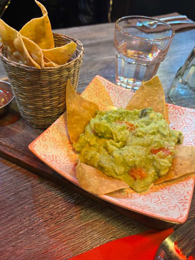 - Purée d'avocats, oignon émincé, coriandre, tomate servi avec des chips