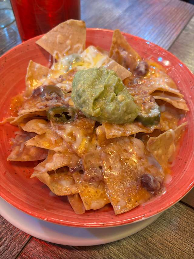 - Chips de mais nappées de fromage fondu, guacamole, haricots rovges et piment jalapeños