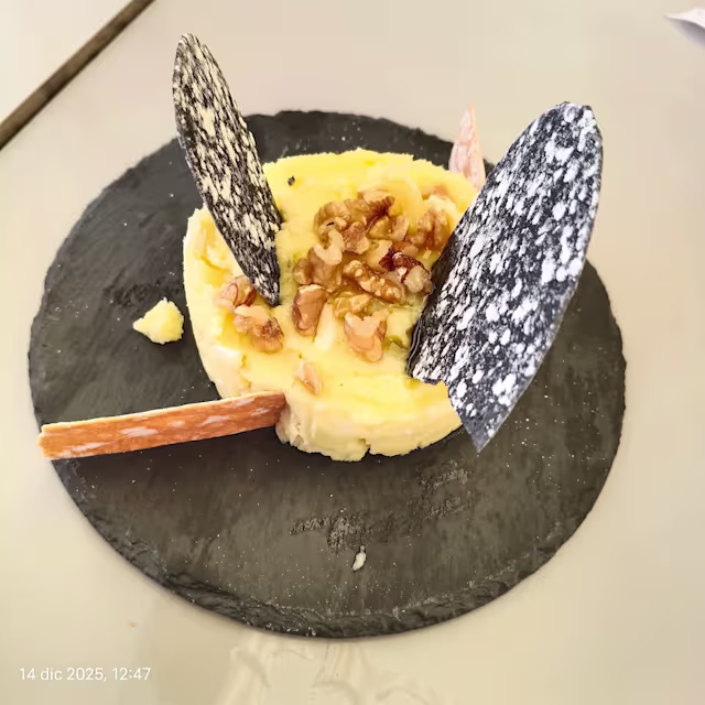 - Selección de jamón curado y quesos variados, servidos para compartir