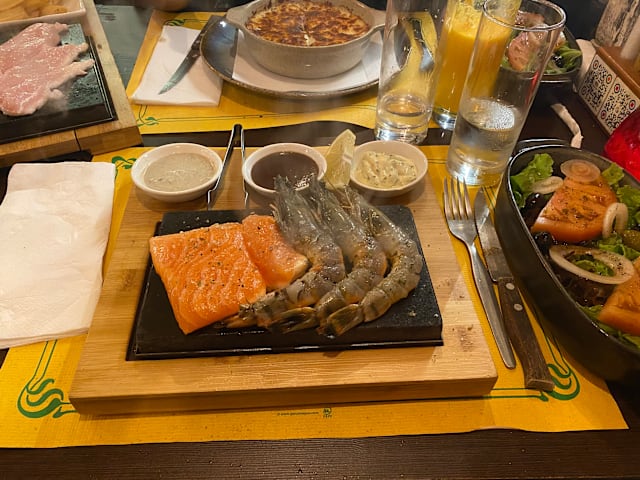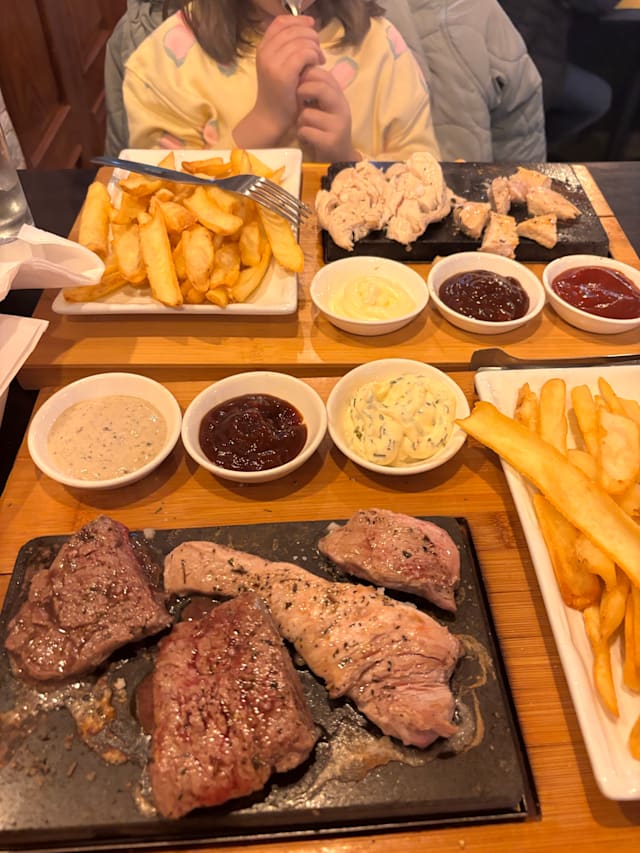 8.5/10Staff were friendly , helpful and spoke English ( a bonus!) Food on the hot plate was fun and delicious .