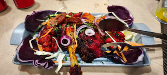 3/10We came here expecting a decent Indian meal in Barcelona, but the food was well below average. The tandoori platter was a mess—while the fish was passable, the chicken was dry to the point of being inedible. No flavor, no moisture, just disappointing. The biryani was a disaster. Bland, poorly cooked, and completely lacking the depth of flavor you’d expect from even a mediocre biryani. Same with their chicken curry. But the real kicker? They had the audacity to charge us €4 for a side of onions. Onions. Something that comes complimentary at the every respectable Indian restaurant. There are too many good restaurants in Barcelona to waste time and money here. Skip this place—you’ll thank yourself later.