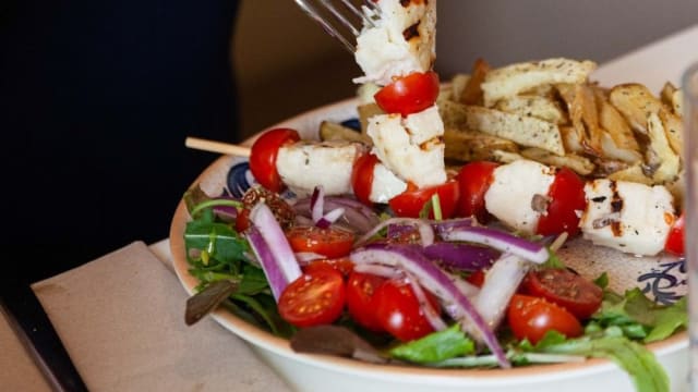 Trois larges mezzes au choix , accompagnés d'une pita ou de pain grillé. *choisisez 3 mezzes *1 pita coupé inclus *petite salade grecque dispo dans la formule *saganaki & calamars exclus