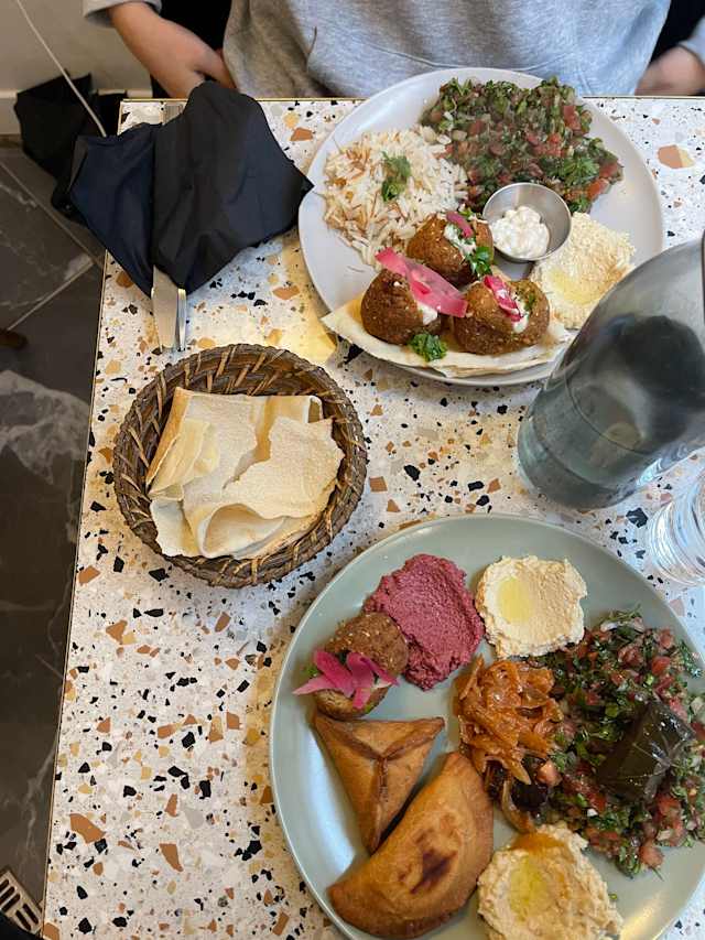 - Houmous, moutabal, taboulé, moussaka, crème de betterave, feuille de vigne, falafel, samboussek fromage et fatayer épinard