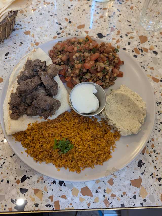 - Nos plats 1 plat + 1 mezze froid + taboulé ou lentilles + riz ou bourghoul 15,00 € kafta 2 brochettes de viande hachée de boeuf, persil, oignon et épices taouk poulet mariné au citron chawarma boeuf tranches de boeuf marinées grillées