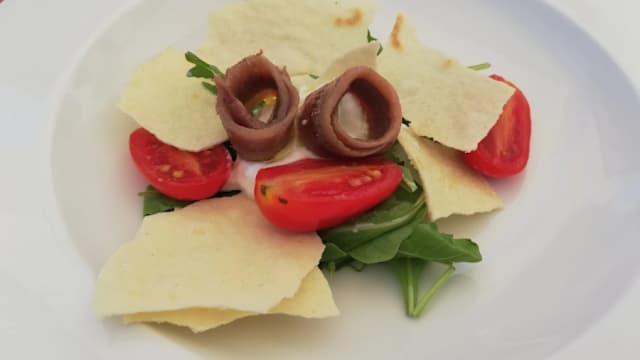 (Insalata di mare, ceviche, pane carasau stracciatella e alice salata)