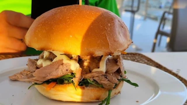 (Panino, porchetta di tonno, verdure agrodolci, mayo al wasabi)