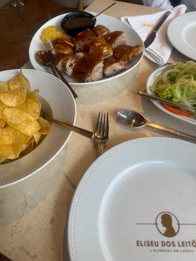 9/10Ok I had the notion that suckling pig with crispy skin was a dish one must sample in Portugal; our Airbnb checked with his father and he recommended Eliseu dos Leitões. The ambience leans toward formal, service was first rate. Starters - pig croquettes and sheep’s cheese quite good, anchovy spread very salty - were good. The three of us all ordered suckling pig and it all came on one plate. They forgot we asked for salad with no onions. I had to remind them I’d asked for mustard and piri piri sauce. The suckling pig was not hot - I had seen it was under a warming light. Fresh potato CRISPS were served in one large bowl. The house red wine was excellent. Am I glad we went - yes, service was actually good; would I go back - not sure but doubtful. I really wanted to try suckling pig - and now that I have I think there are better restaurants out there, less fancy and less expensive.