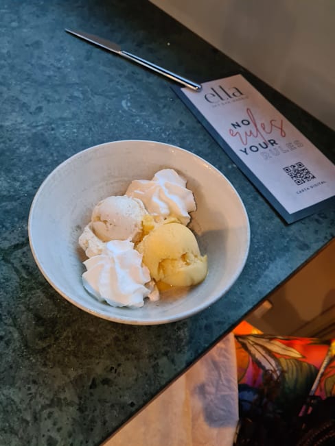 8/10Small starter plates of ceviche, guacamole, ham and cheese, cheese and ham croquettes. A great burger with onions bacon and bourbon source and home made skin on fries. Dessert of cheesecake with a subtle hint of Parmesan. Mimosa to drink, made with fresh orange and cava.