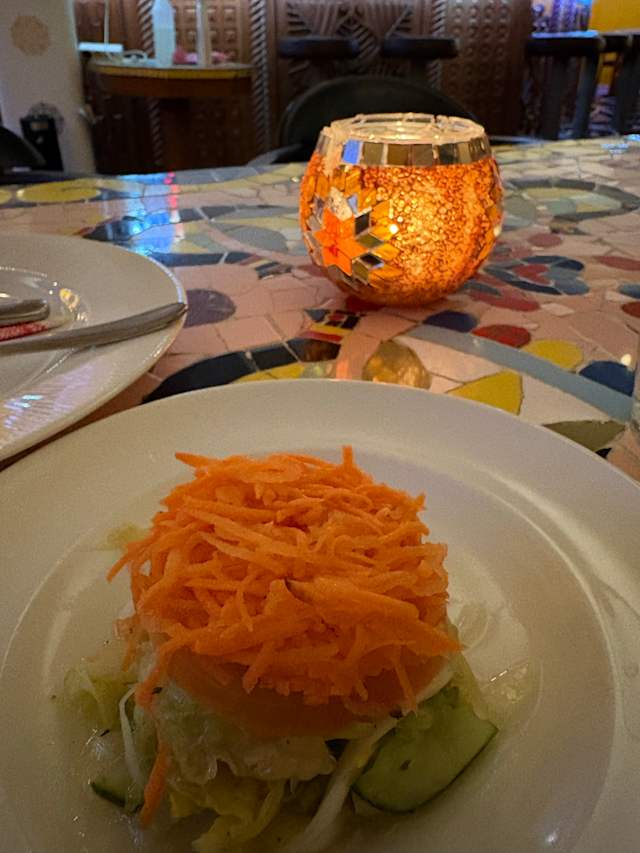 - Lammspenat (nr 51), biff balti (nr 65), biff sambal masala (nr 62), pullao ris, sallad och yoghurt