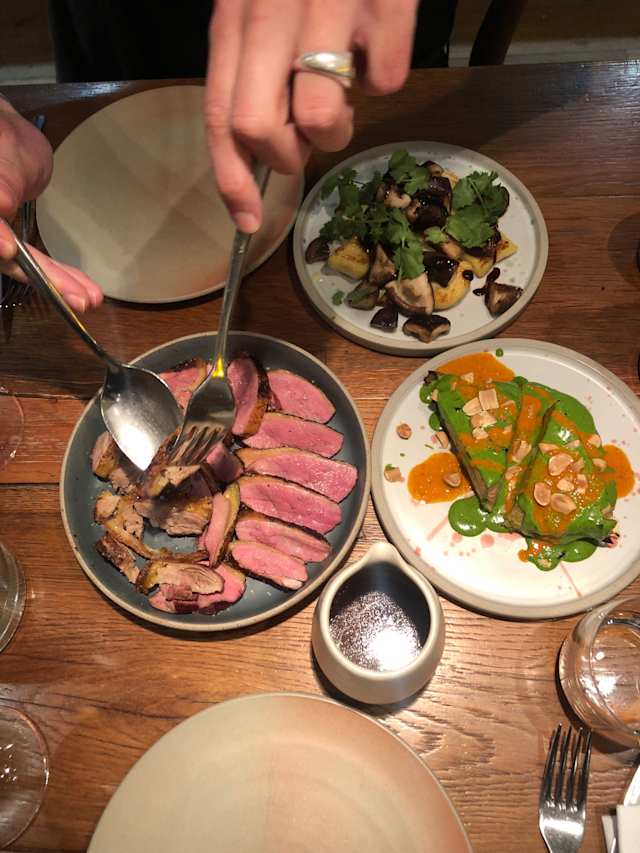 - Cuit au barbecue, crème de maïs & harissa, jus de viande