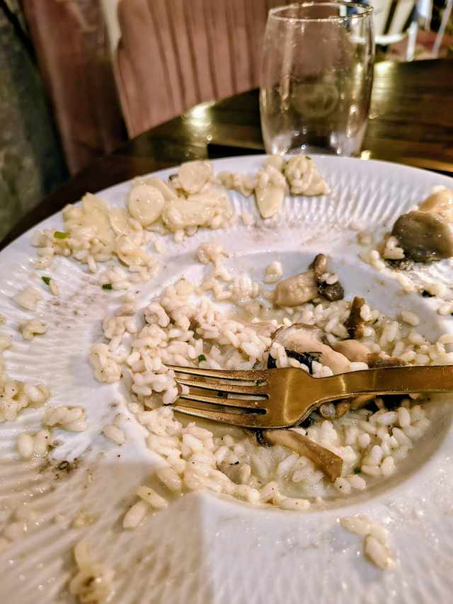 5.5/10lovely waitress, understood nut allergy requirements, but then wrong food delivered which didn't inspire confidence. mushroom risotto was slimey, sea bass overcooked with wierd bitter greens. cod cake was tasty but a bit greasy. vegetarian pasta was a hit. summary: nice staff but food not great.