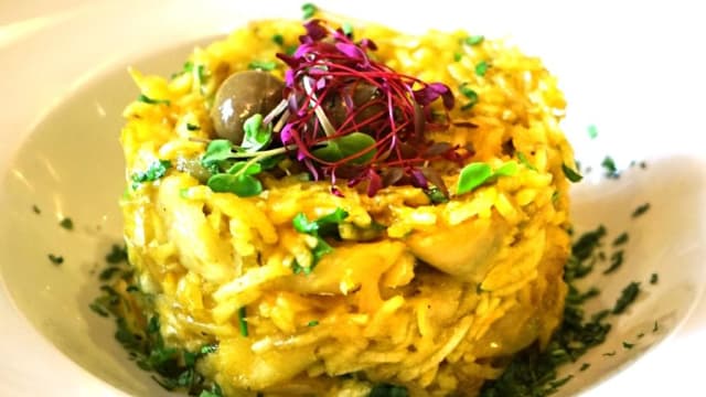 Arroz arbóreo, anéis de lula, camarão, améijoas, vinho branco e coentros