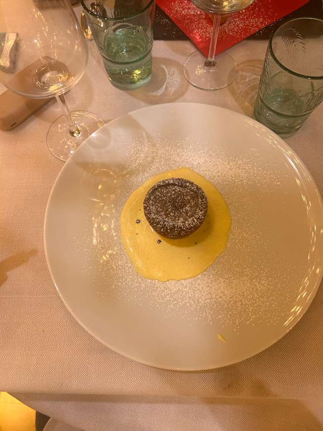 - Tortino di formaggio cremoso servito con terra al cioccolato e salsa alla Sambuca