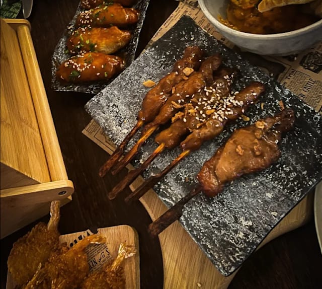 Gegrilde saté van kipfilet met atjar en satésaus. Incl. friet en coleslaw.