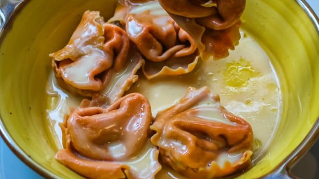 Tortello rosso ripieno di zucca e amaretto con crema di parmigiano