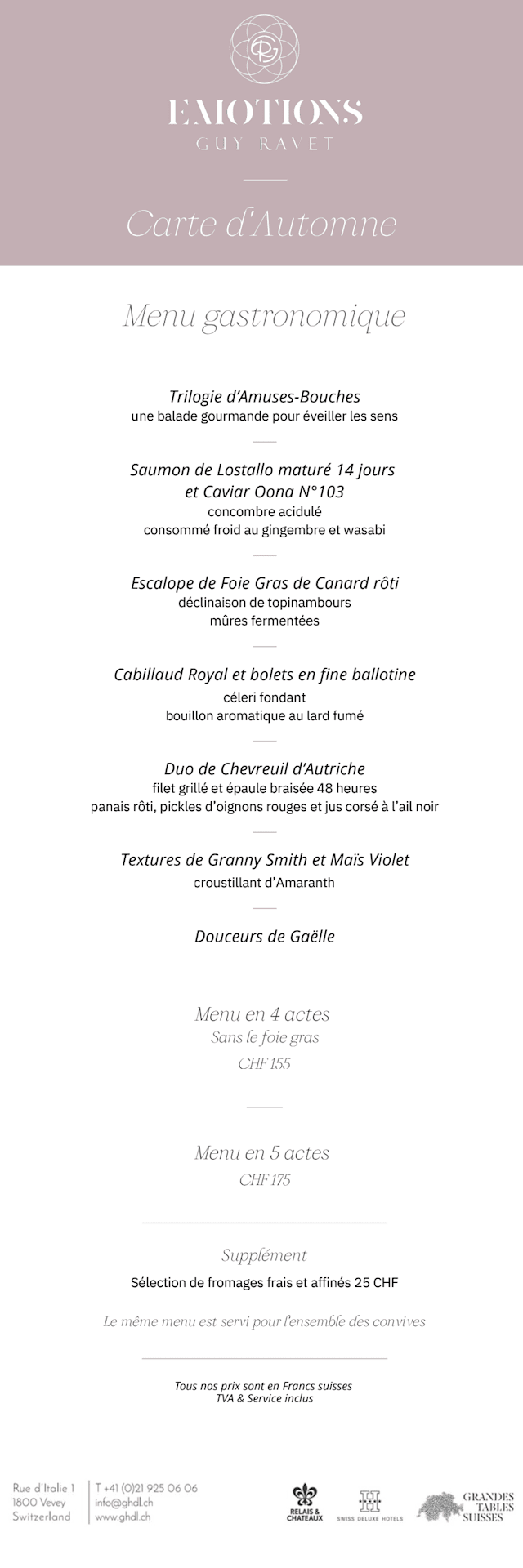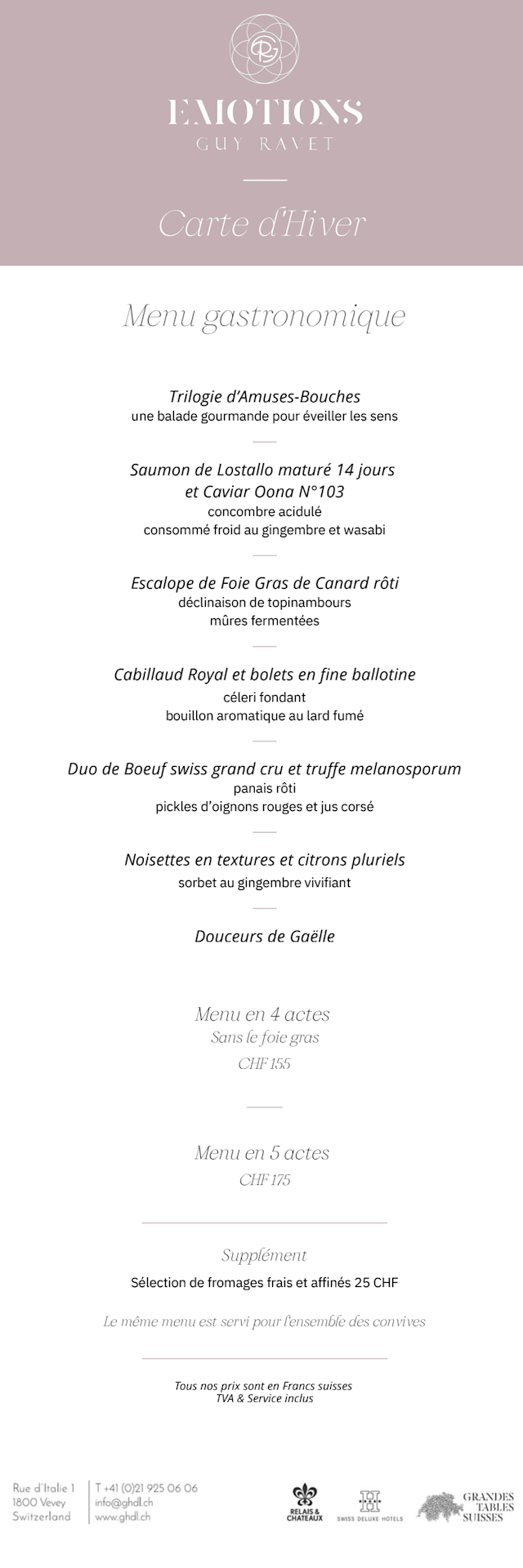 Un subtil mélange entre respect de la tradition et modernité. Fort d’une grande expérience auprès de grands Chefs et avec la culture du goût comme héritage, Guy Ravet est toujours à la recherche de nouvelles saveurs et créations.