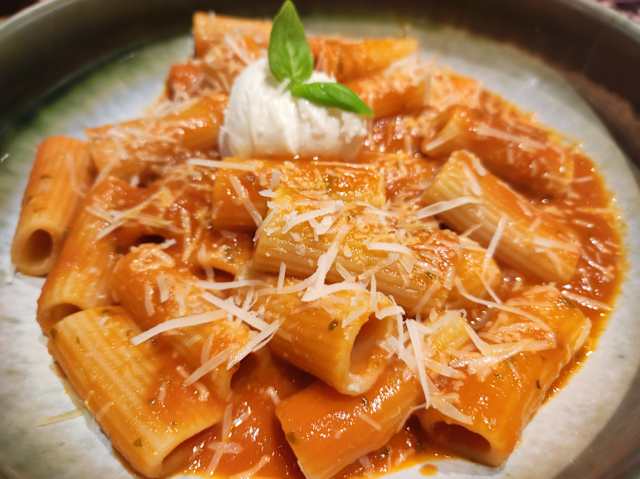 - Rigatoni corti con salsa di pomodoro san marzano, basilico fresco e mozzarella di bufala.