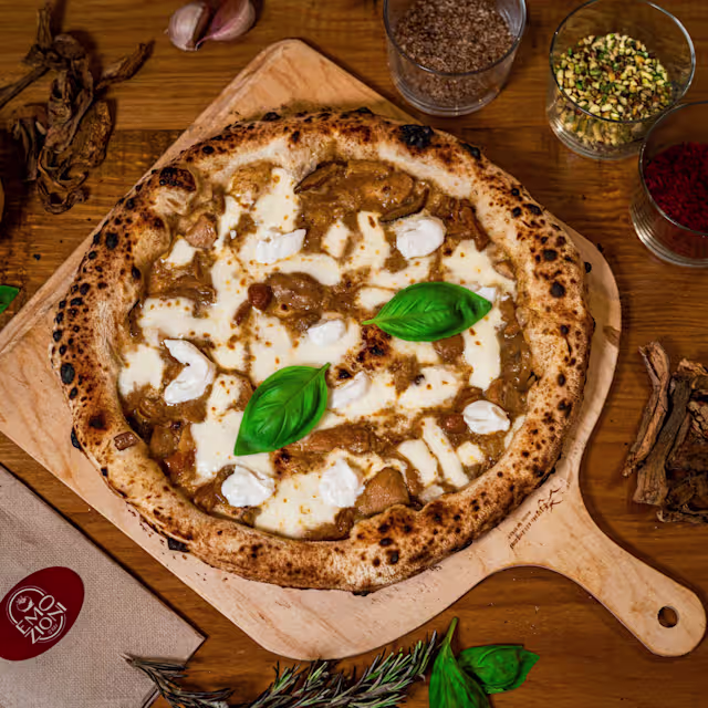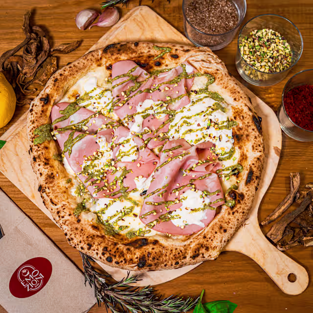 - Elegancia verde y armonía mediteránea. Fiordilatte, mortadella artesanal, stracciatella, pesto de pistacho, granillo crujiente y un toque fresco de ralladura de limón. Delicada, aromática y adictiva