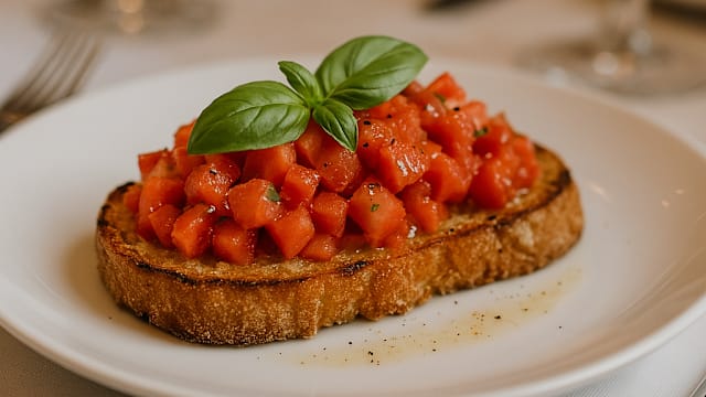 Pane croccante tostato, condito con pomodorini freschi, basilico profumato e un filo d’olio extravergine. Un morso di estate, semplice e fragrante.