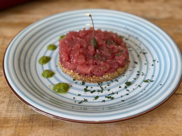 - Tartar di tonno al profumo di zenzero, olio emulsionato al limone, frutto del cappero e granella di tarallo