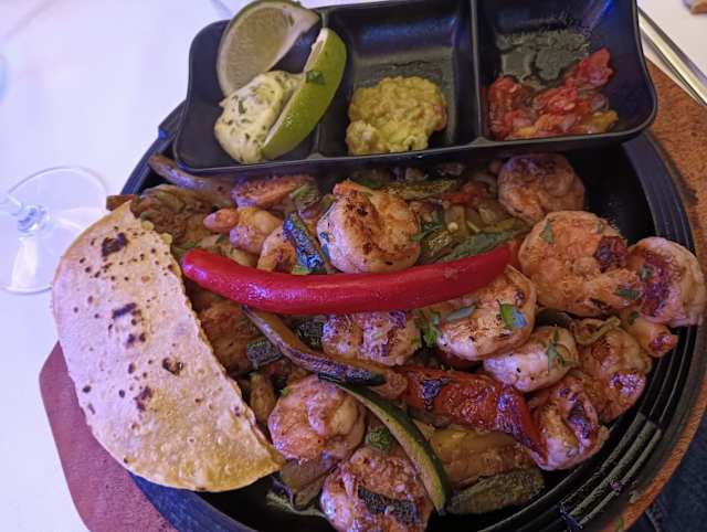 - Gamberi alla griglia con zucchine, peperoni verdi, rossi e gialli. Accompagnati da tortillas, guacamole, pico de gallo e sour cream.