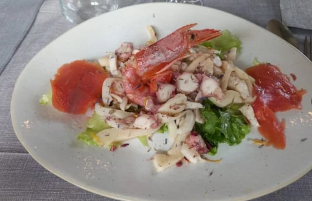 - Misticanza, erbette spontanee, finocchi marinati, salmerino e salsa all'arancia