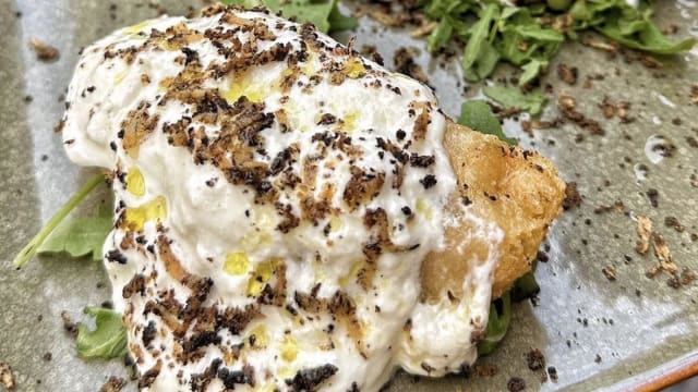 Bufalona di mare fritta con crudo di gamberi rossi e tartufo