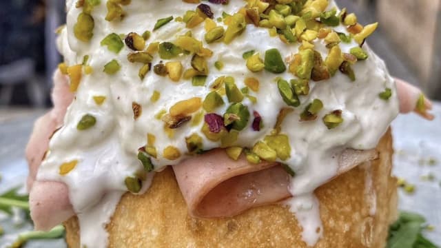 Pizzottelle fritte con stracciatella, crudo di gamberi rossi e crudo di scampi al pistacchio