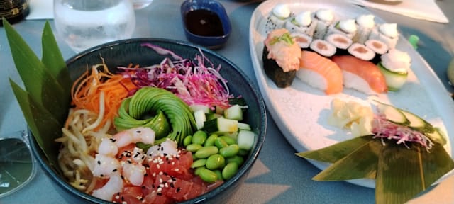 Composé de dès de saumon,thon, crevettes et légumes frais marinés ( chou rouge, pousses de soja, carottes, édamamé, avocat, concombre, betterave chiogga et graines de sésame ). servi dans un bol de riz vinaigré