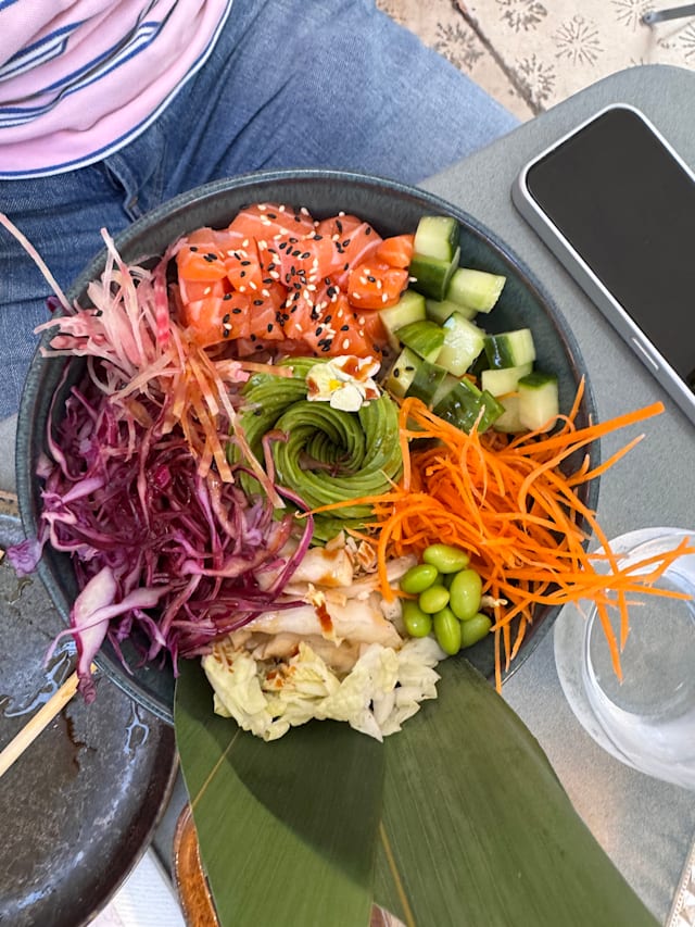 Dés de saumon, avocat, concombre, chou rouge, édamamé, graines de sésame, pousses de soja. Servi dans un bol de riz vinaigré