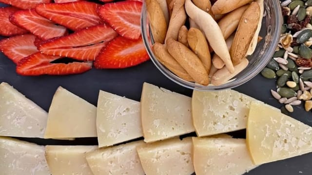 (Lechuga variada, frutos secos, uvas pasas, mermelada de tomate, bálsamo de frutos rojos y queso de cabra)