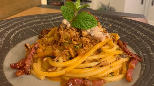 Tonnarelli di Pasta Fresca con Ragù di Polpo. Al Piatto con Chips di Cipolla Croccante, Mentuccia e Guanciale di Suino Nero dei Nebrodi