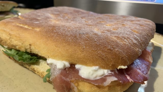 Prosciutto cotto di bufala, crema al tartufo nero, mozzarella di bufala, scaglie di parmigiano reggiano 30 mesi