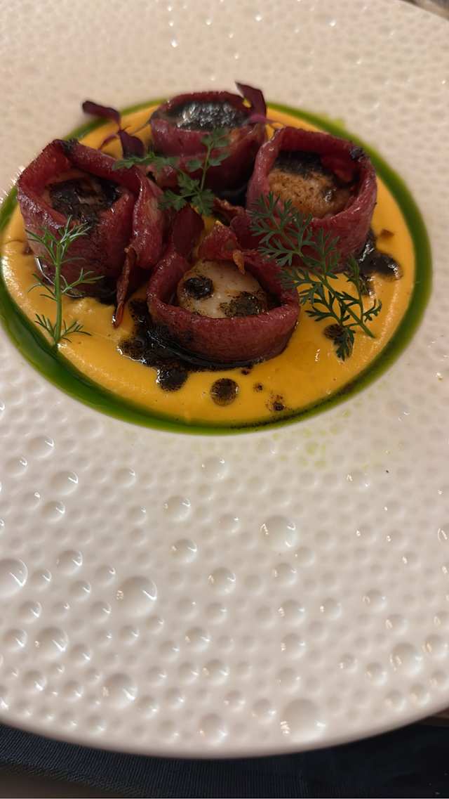 - Capesante glassate al miele su salsa al finocchietto e prosecco con olio ai gamberi e caviale tobiko al wasabi