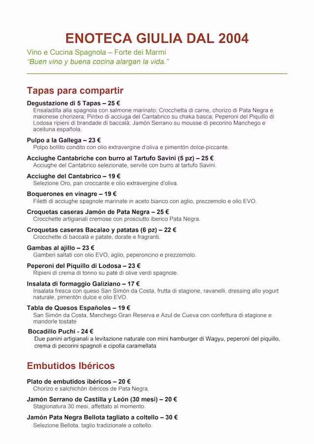 5.5/10Unfortunately, my experience at Enoteca Giulia did not live up to expectations. I was particularly disappointed with the food, especially the patatas bravas and paella. The patatas bravas were nothing like the ones you find in Spain — were like chips. As for the paella, it was extremely salty, making it almost impossible to enjoy. Given the reputation of the restaurant, I had expected much better.
