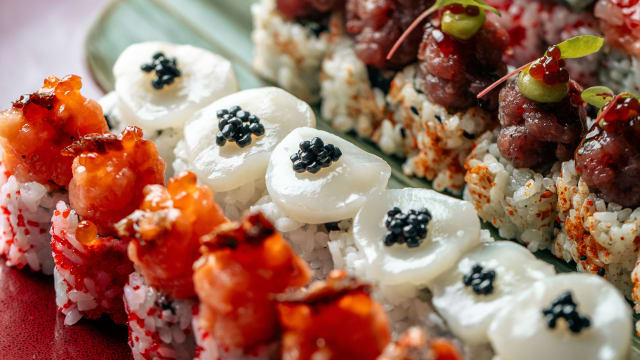 Riso sushi, gambero impanato, salmone battuto a mano, salsa teriyaki, ikura, avocado, sunomono, goma wakame, edamame e salsa pokè