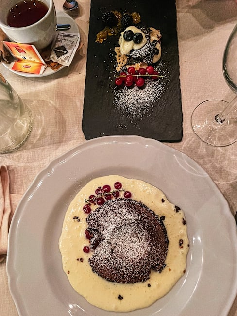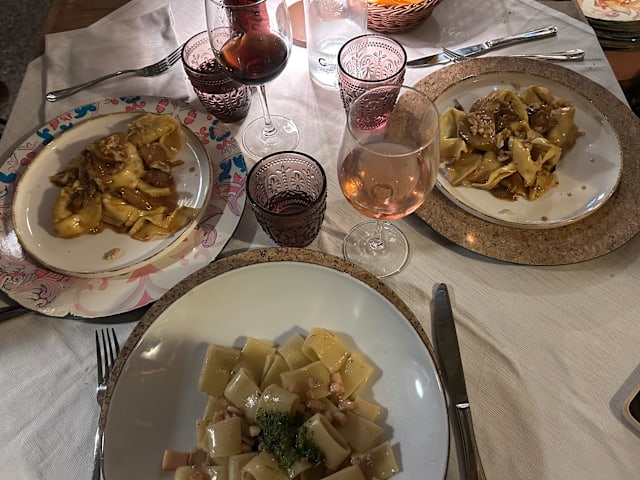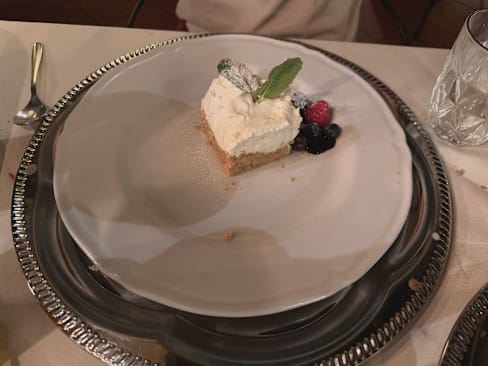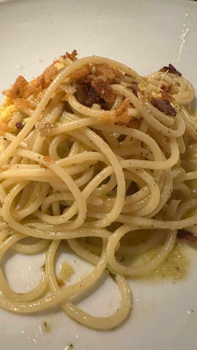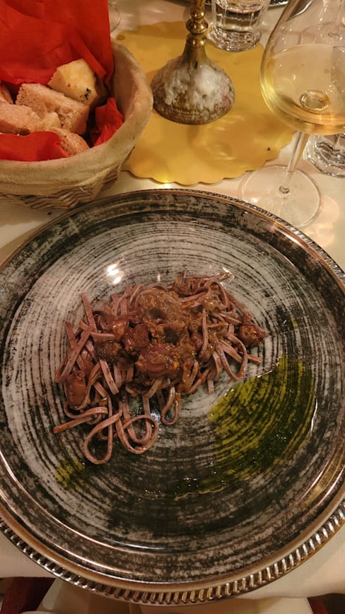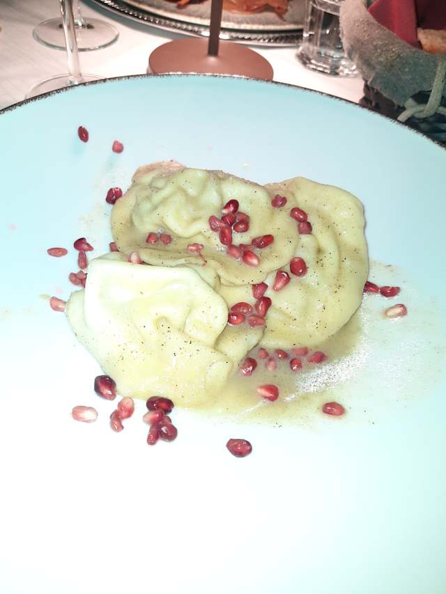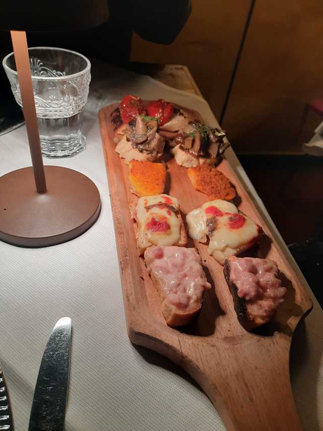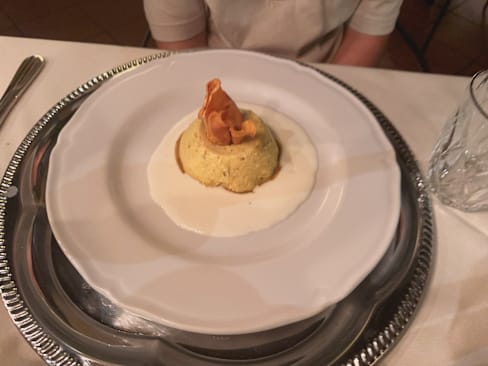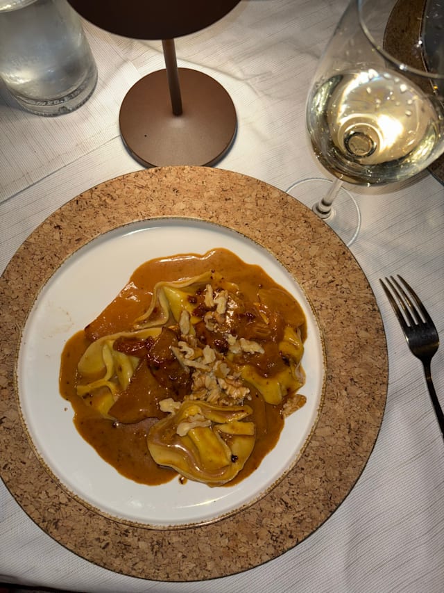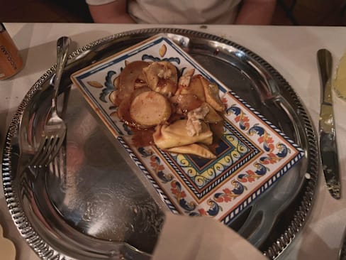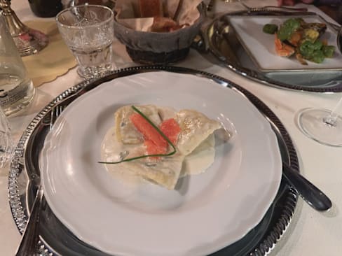7.5/10Tasted several dishes among us. Most good. The tortelli with gorgonzola and pear caramelized in brandy were delicious but too sweet for a primo. Desserts good. Main criticism is portions too small particularly for pasta courses.