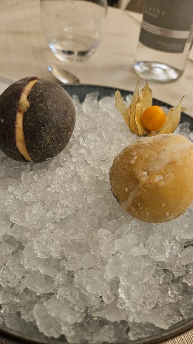 Al sesamo nero, variazione datterino giallo e rosso, vinaigrette al bergamotto e kefir