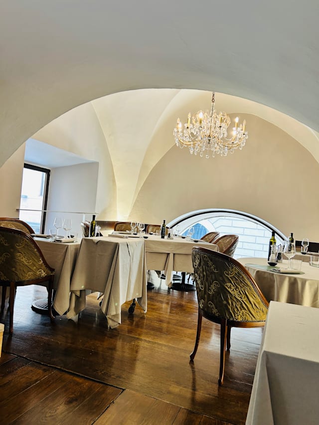 10/10Second visit to this restaurant and what a treat both times. Excellent food, matched wines and impeccable friendly service. Close to the Duomo but avoids the tourists. Ceiling and walls covered in frescos. Highly recommended.