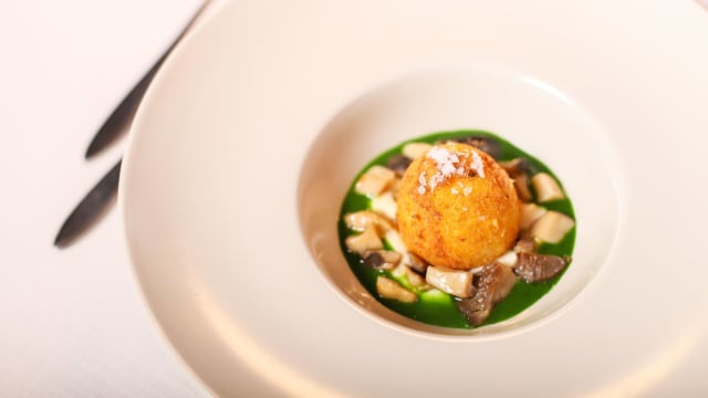 Uovo fritto con asparagi di pernumia e fonduta di formaggio ai 2 latti