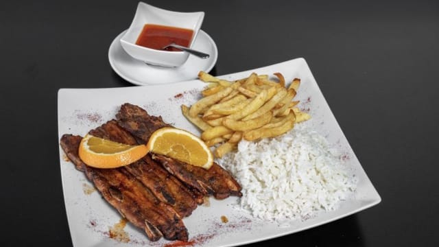 poitrine, poulet, saucisse et travers servis avec frites et riz