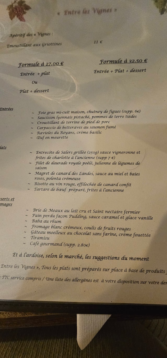10/10In Paris fairly often and cannot visit Entre les Vignes too many times! Difficult to get by the fantastic entrecote with red wine jus following a starter of beetroot and smoked salmon salad. Carole was wonderfully attentive and helpful as always. Thoroughly recommended!