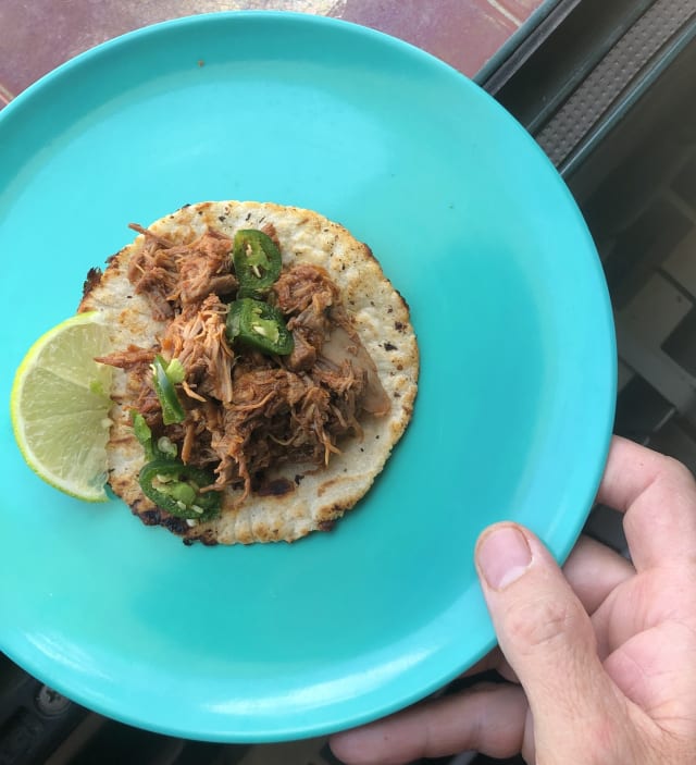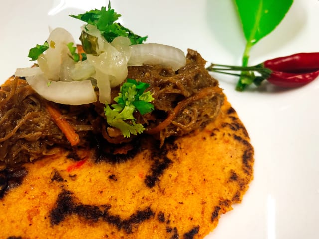 con chile guajillo sobre totopos de maíz con cebolla chalota.