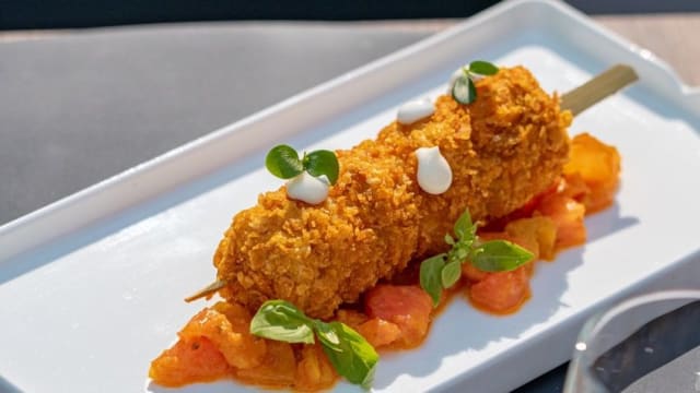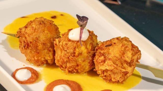 Fior di latte, porchetta arrosto, patate al forno, porri fritti, fonduta di pecorino