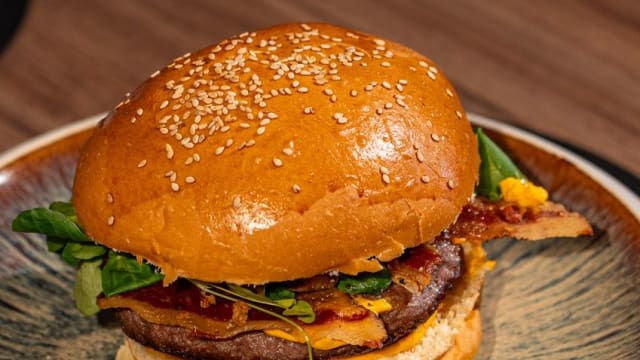 Hamburger di manzo da 200 gr, bacon, cheddar, cipolle fritte, tabasco. Iceberg, pesto di pomodorino bruciato