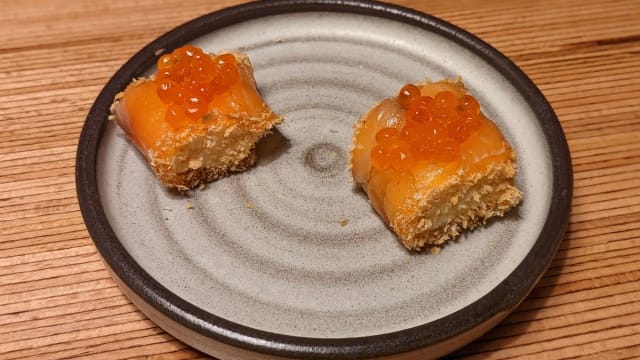 - Bikini de salmó fumat amb “crème fraîche” i caviar de salmó