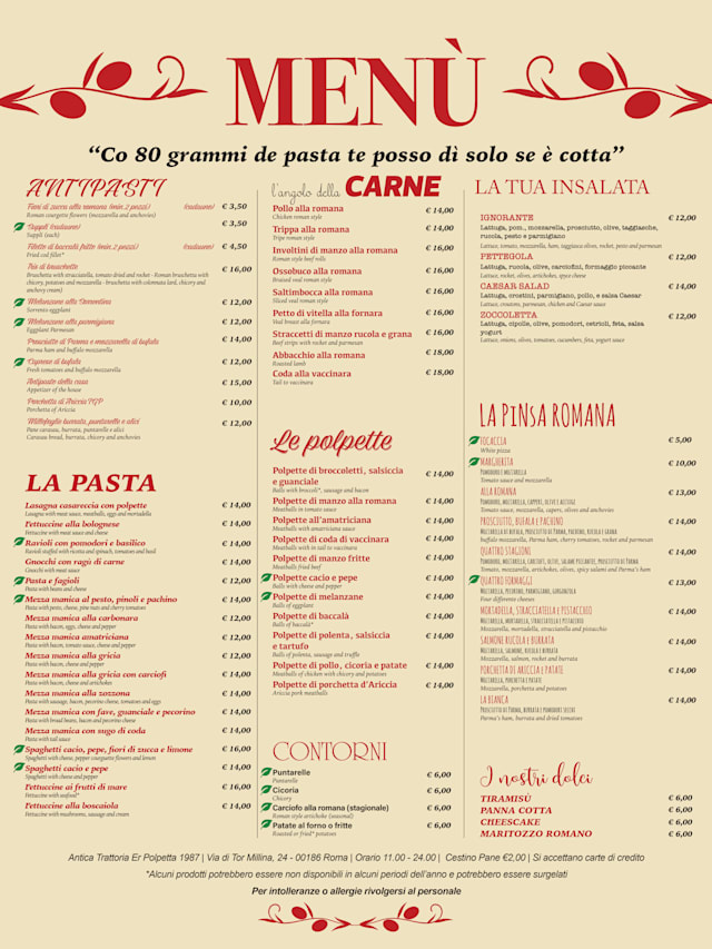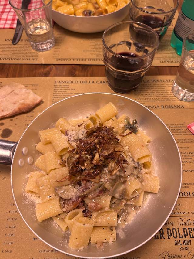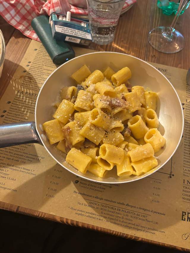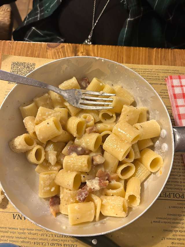 5/10I always visit this restaurant when in Roma. This time was a disappointment. The carbonara was not the same quality, the polpetta did not agree with me. The server put a whole pizza in a plastic container on top of each piece ruining the pizza. Unfortunately, I will not be returning.