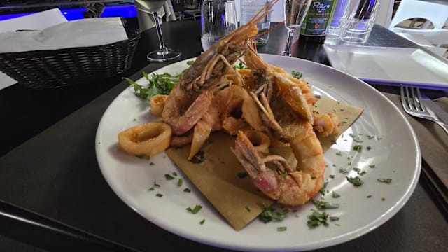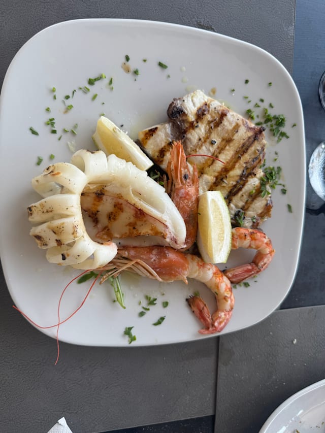 - Pesce spada, gamberoni, calamaro, insalata misticanza, olio evo