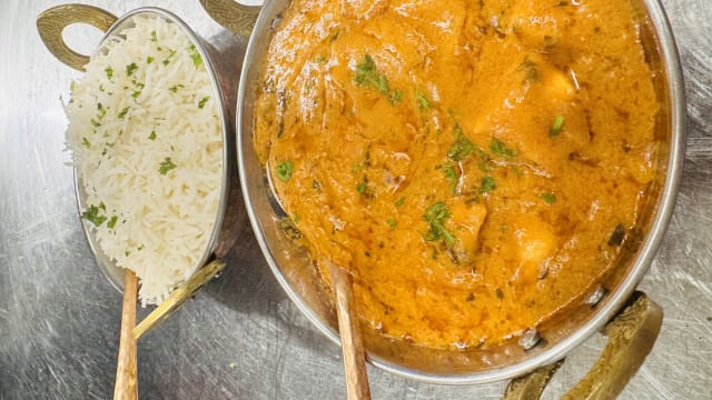 Spezzatino di pollo in salsa curry e spezie “methi” (crema di anacardi), burro e pomodori freschi