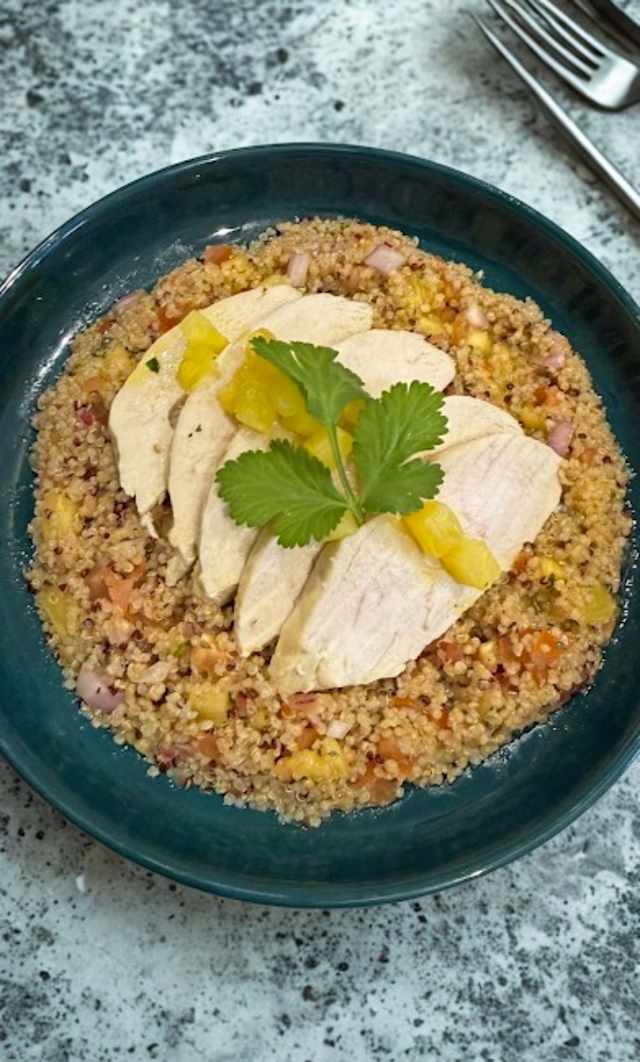 - Deleitante pechuga marinada sobre quinoa fresca, acompañada de piña, plátano maduro asado y una porción de pico de gallo, cubierto con nuestro aliño de maracuyá.